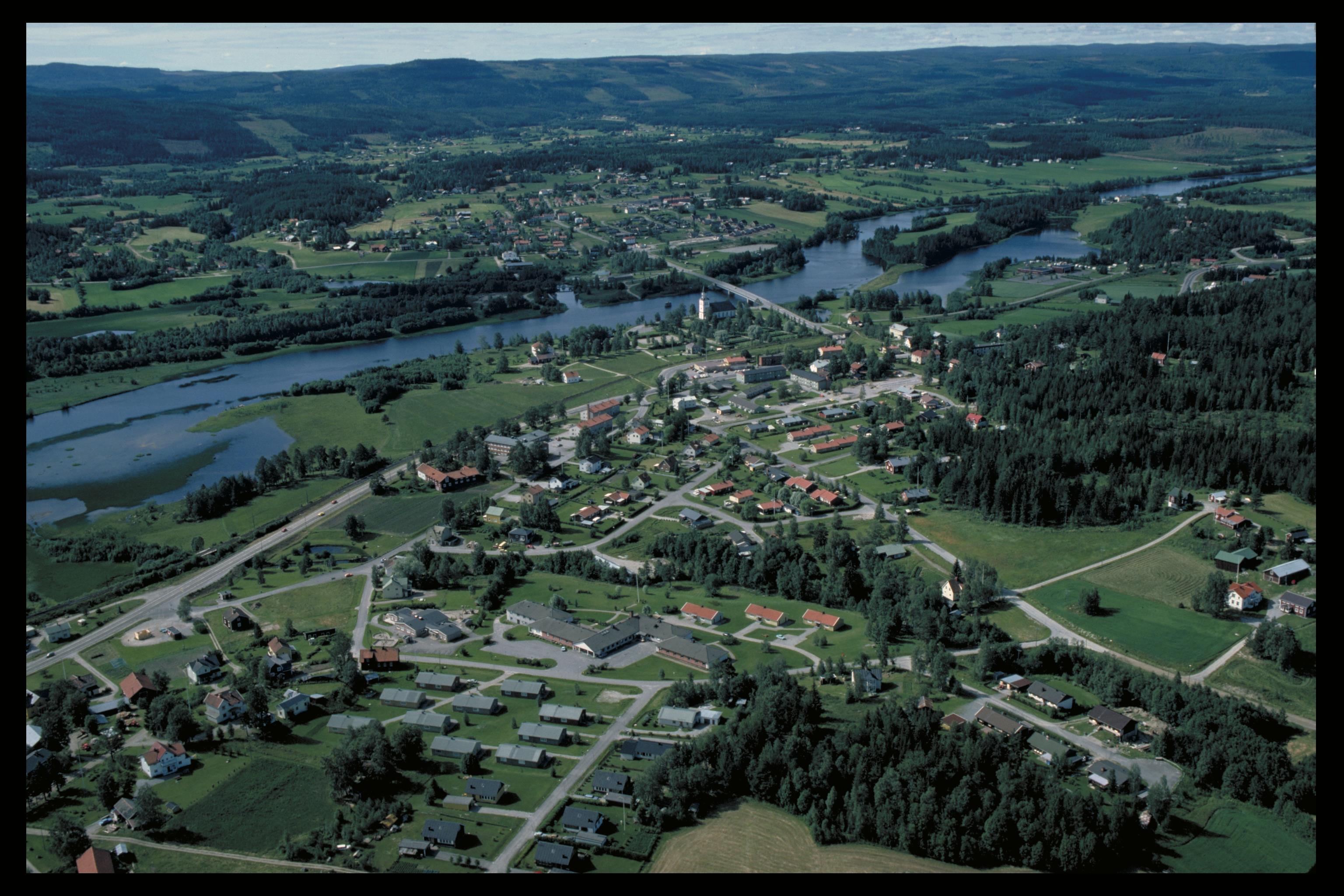 Stöde kyrka i bildens mitt. Bilden troligen från början av 1980-talet.