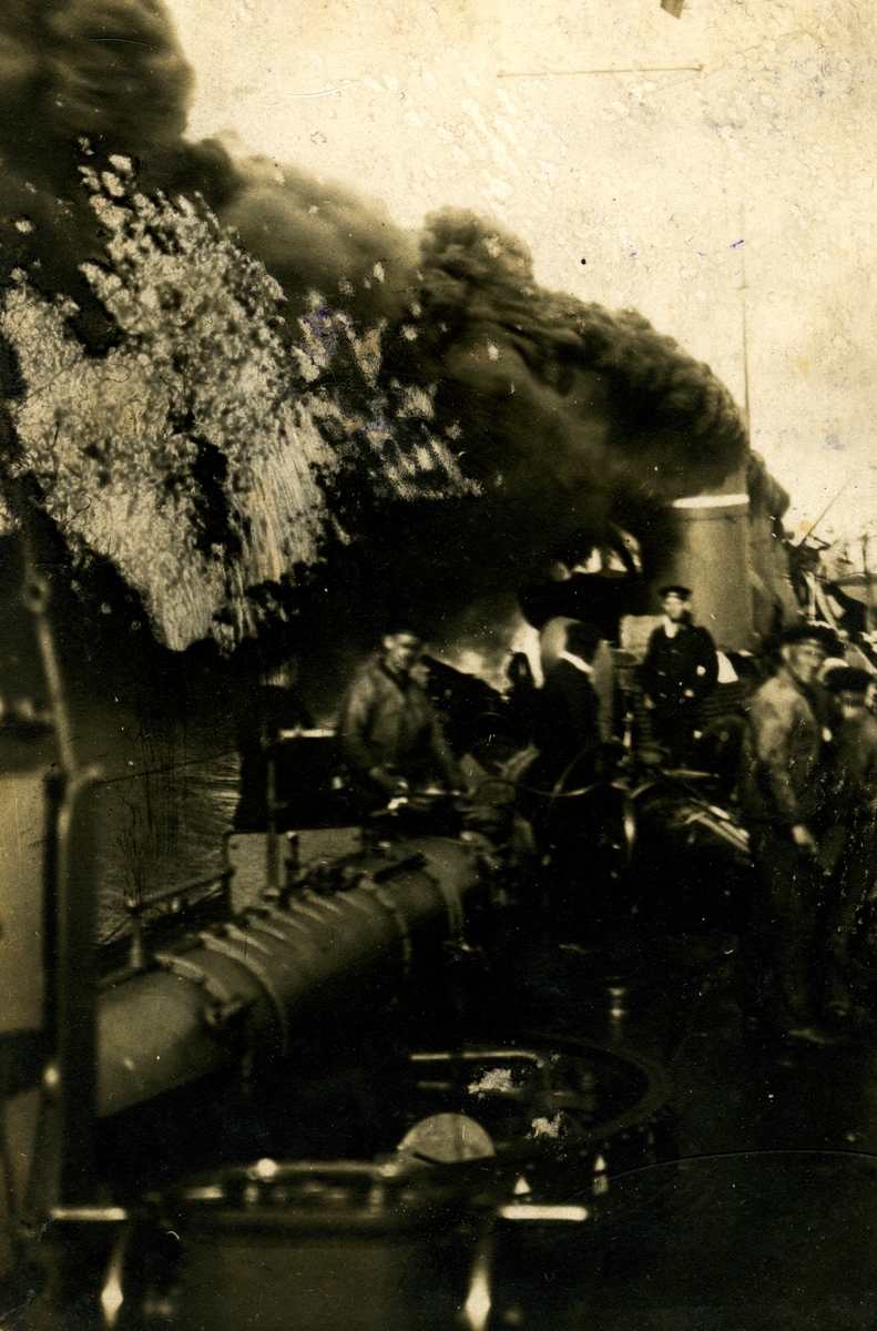 Svart rök från skorstenarna ombord.