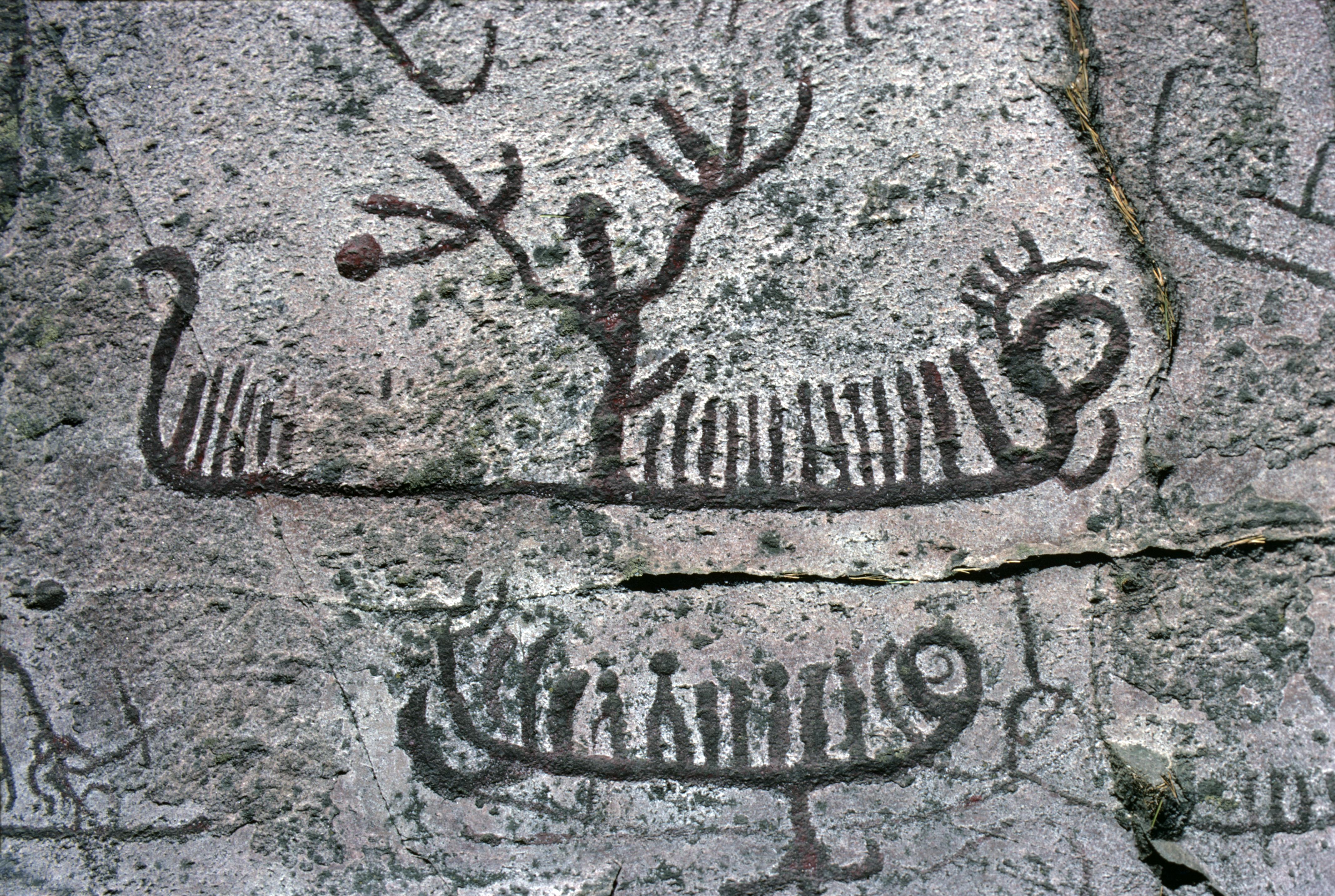 Hällristning med bl a skeppsmotiv. Bilden troligen från omkring 1970.