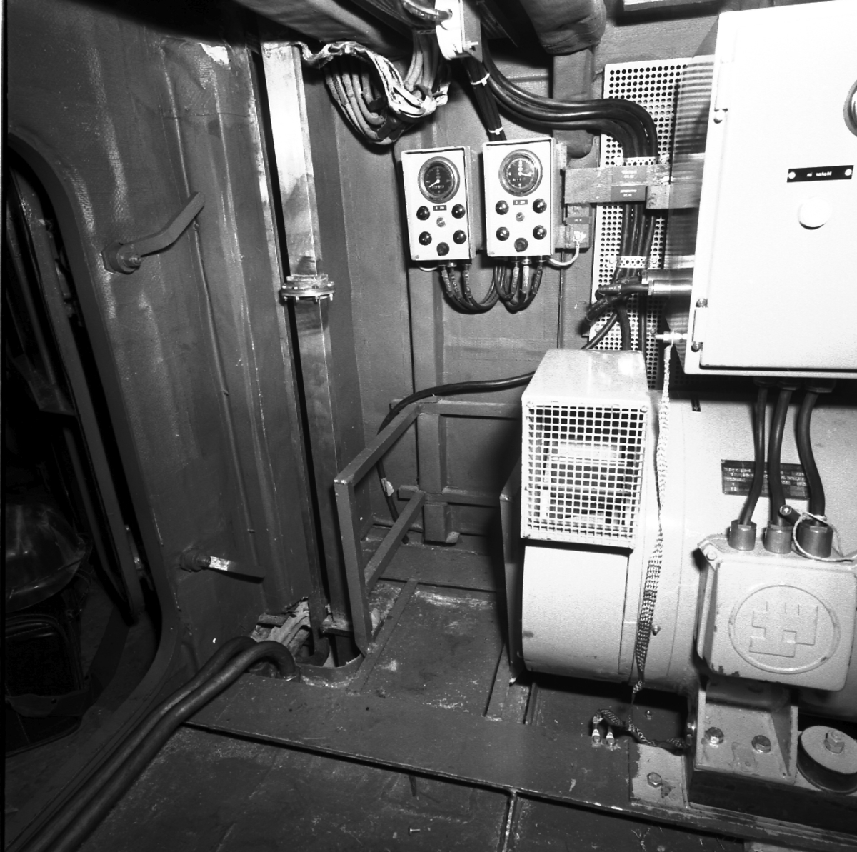 Titel: Piteå och Västerås Interiörer av torpedbåtarna Piteå och Västerås.\\Styrmaskin, SLC, maskinrum och bryggan.