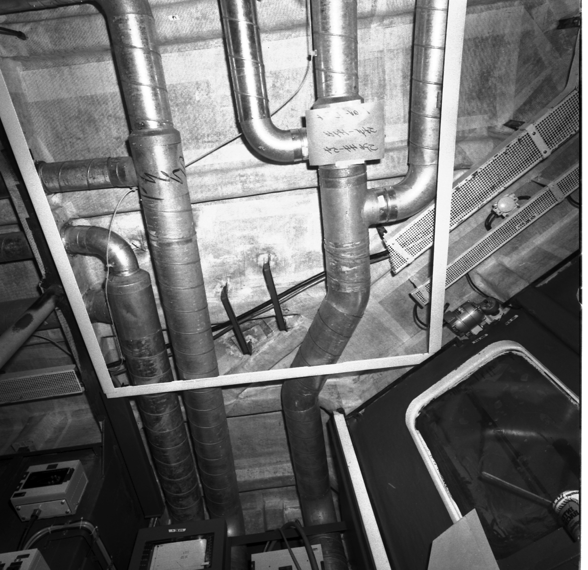 Interiör av minfartyget Carlskrona, rör arrangemang i taken