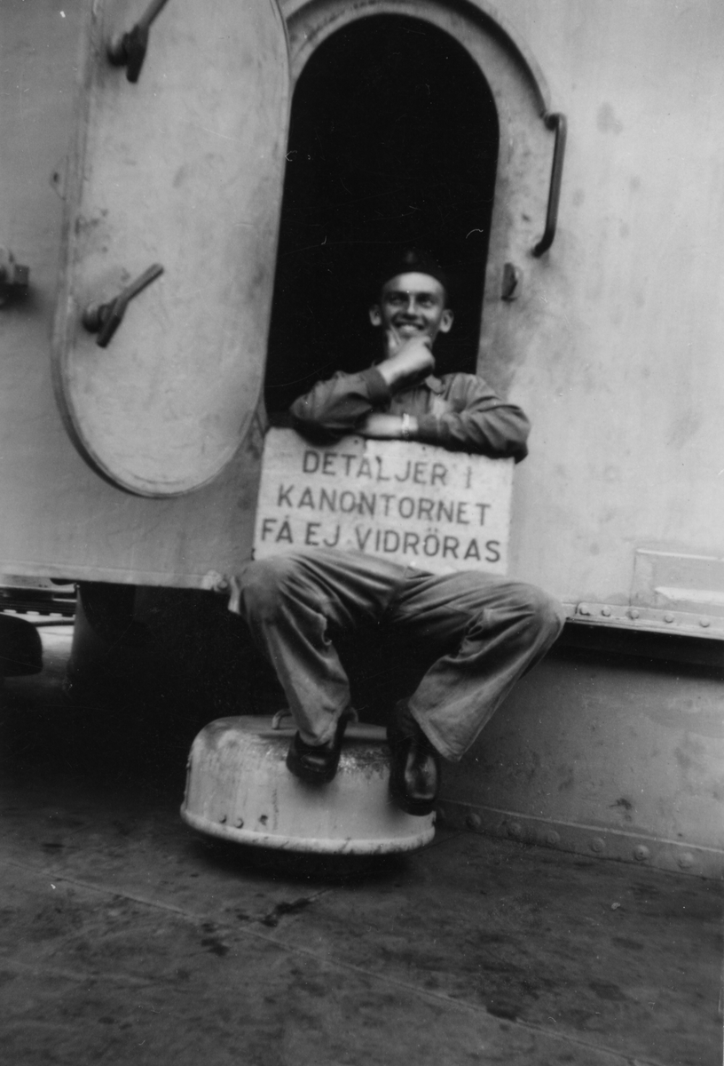 Man sitter med skylt i famnen med texten "Detaljer i kanontornet få ej vidröras."