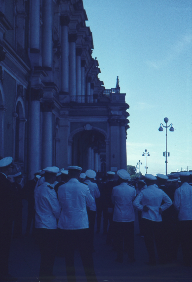 Titel: Kollegor i sommaruniform framför entré till Vinterpalatset