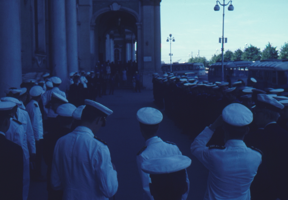 Kollegor i sommaruniform framför entré till Vinterpalatset