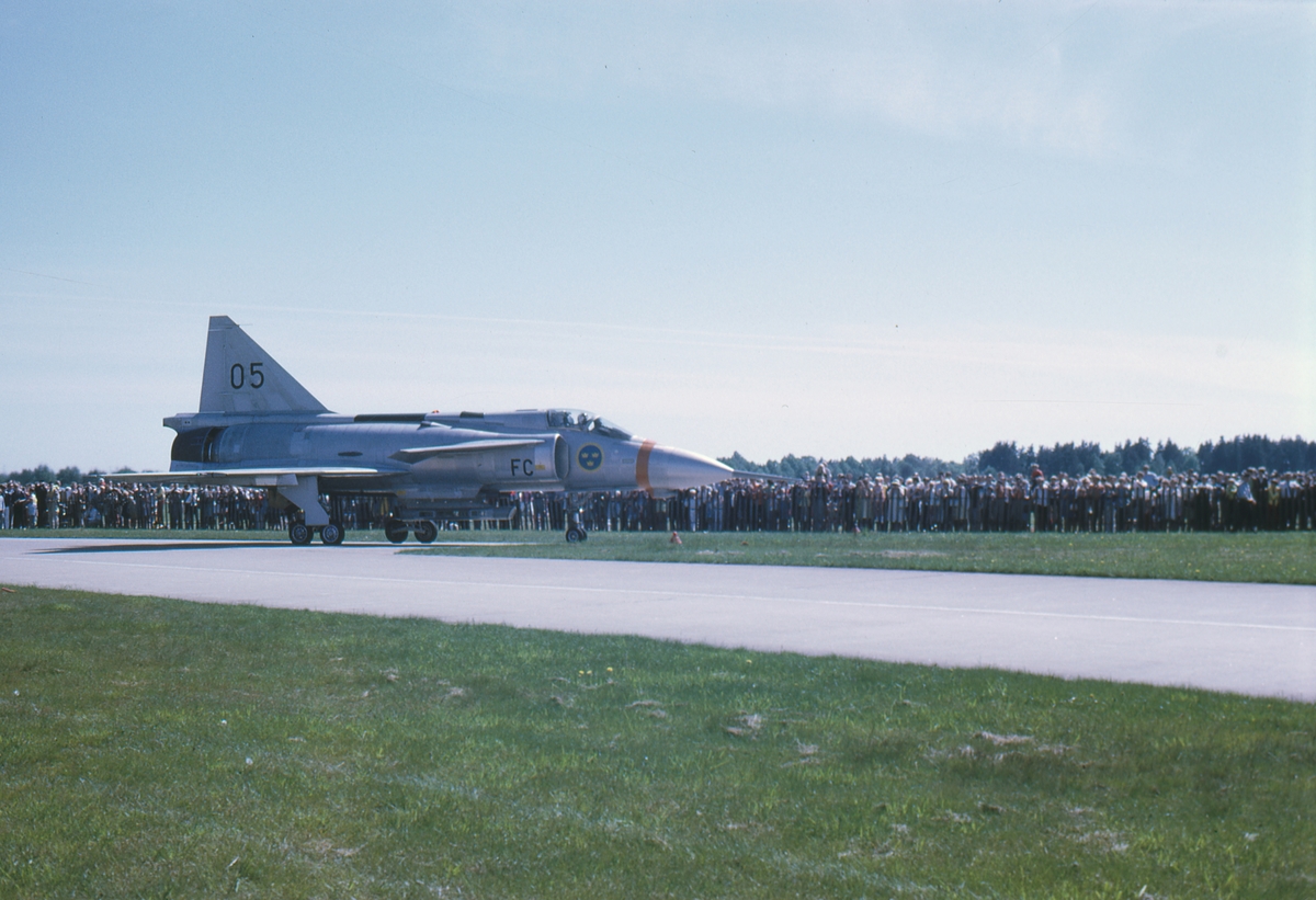 Saab J 37 Viggen på startbanan, många åskådare