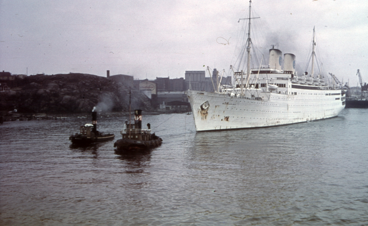 Två Lotsbåtar som bogserar ut ett fartyg.