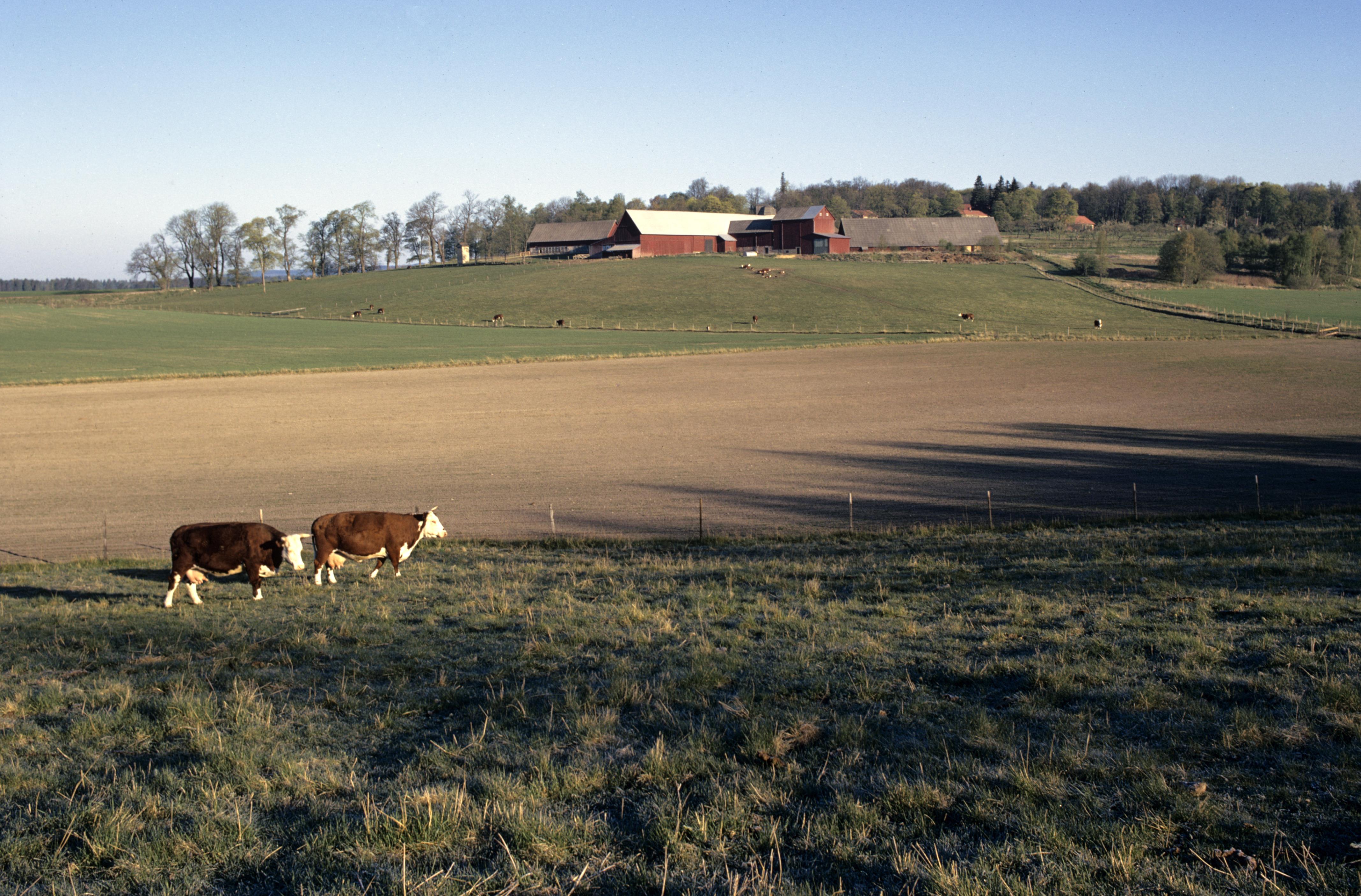 Betande kor, i bakgrunden bondgården. Bilden troligen från mitten av 1970-talet.