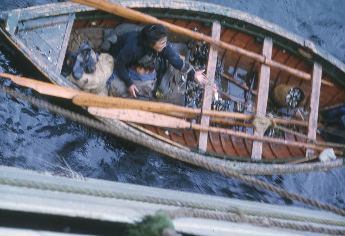 Alakcalufisk kvinna med litet barn nere i roddbåt
