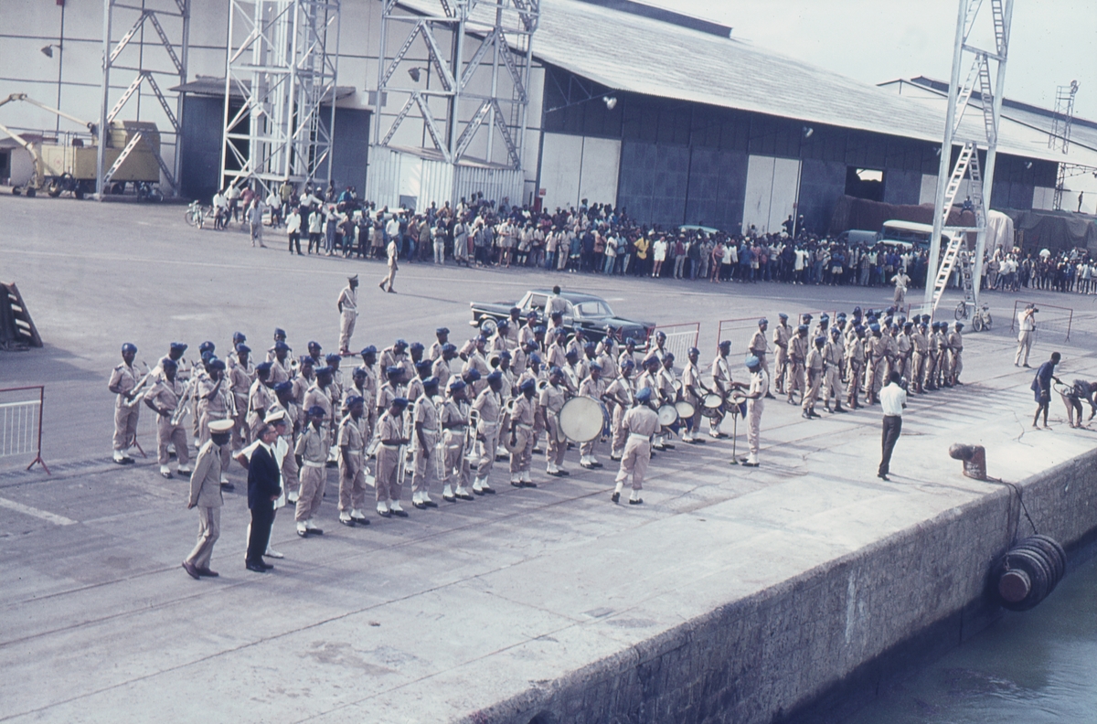 Militärmusikkår spelar i hamnen när Älvsnabben anlöper hamn