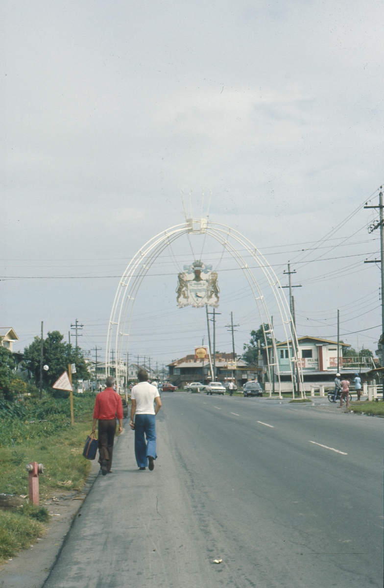 Två kollegor till fots, framför dem Guyanas stadsvapen