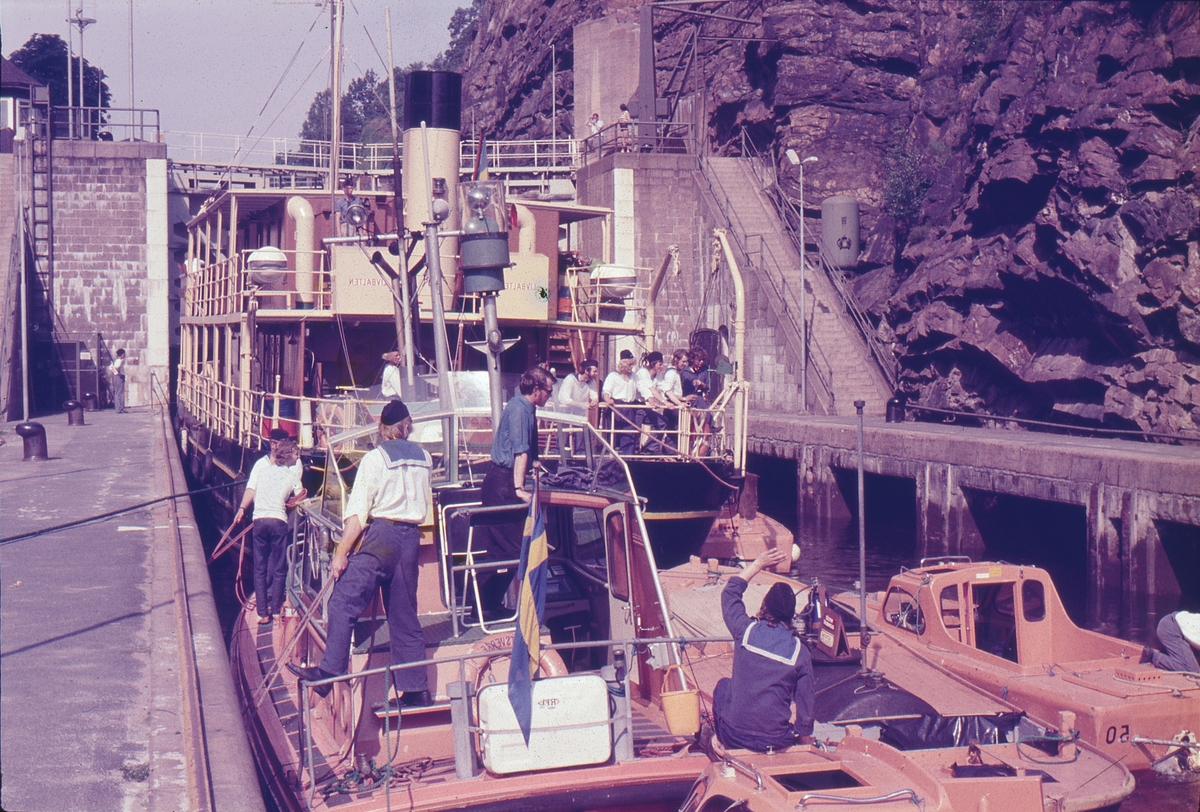 Troligen sjömätaren Ran på väg genom kanalen, besättningen i arbete i slussen