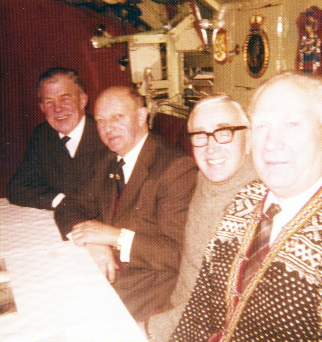 Fyra äldre män, nere i U-båten Gäddan 1970.