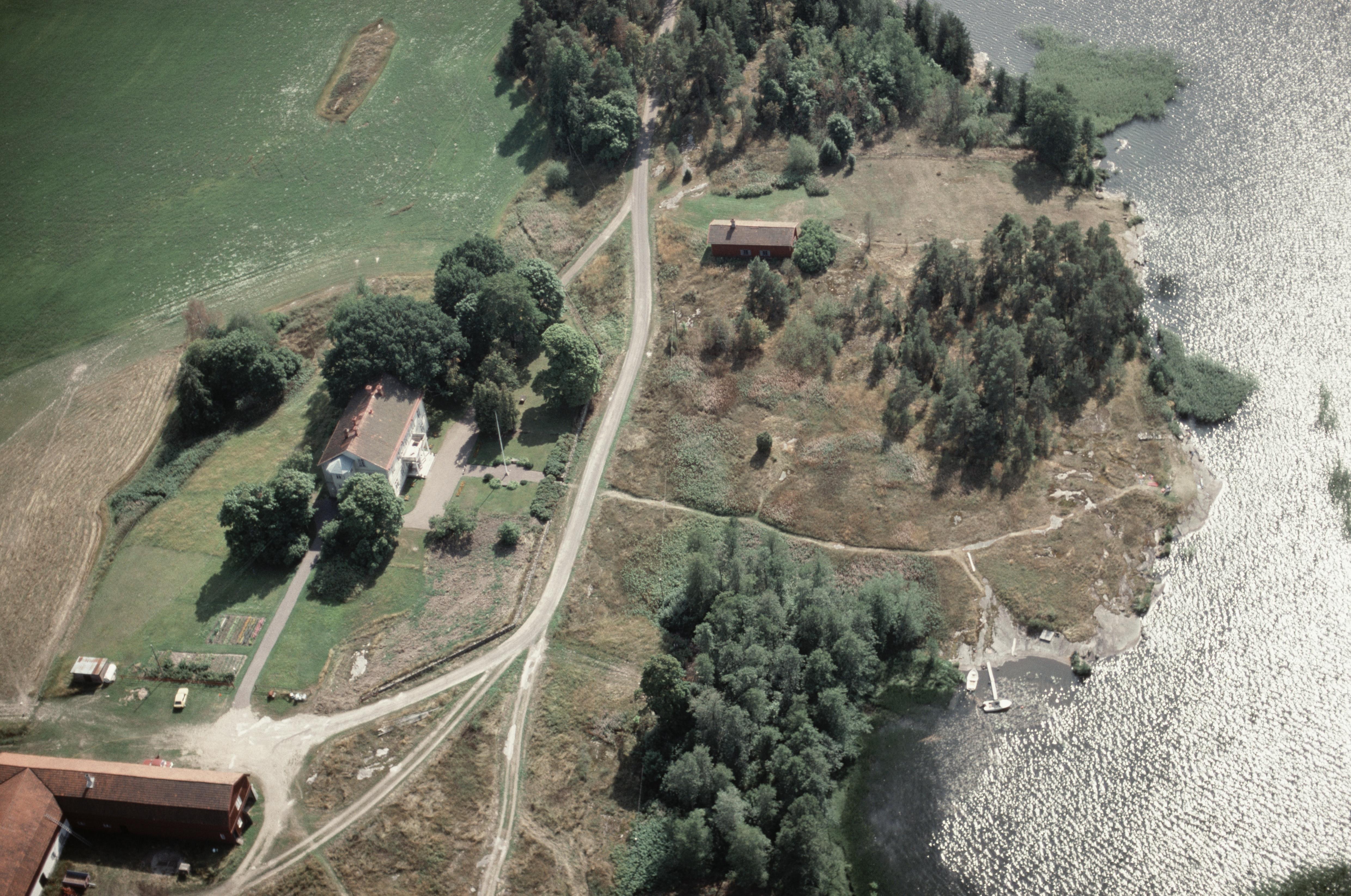 Byn och Frödingsstugan (skrivs även Frödingstugan) vid sjön Alstern. Uppe till höger stenhäll Trollbordet RAÄnr Alster 46:1. Bilden är tagen mot (väderstreck): S