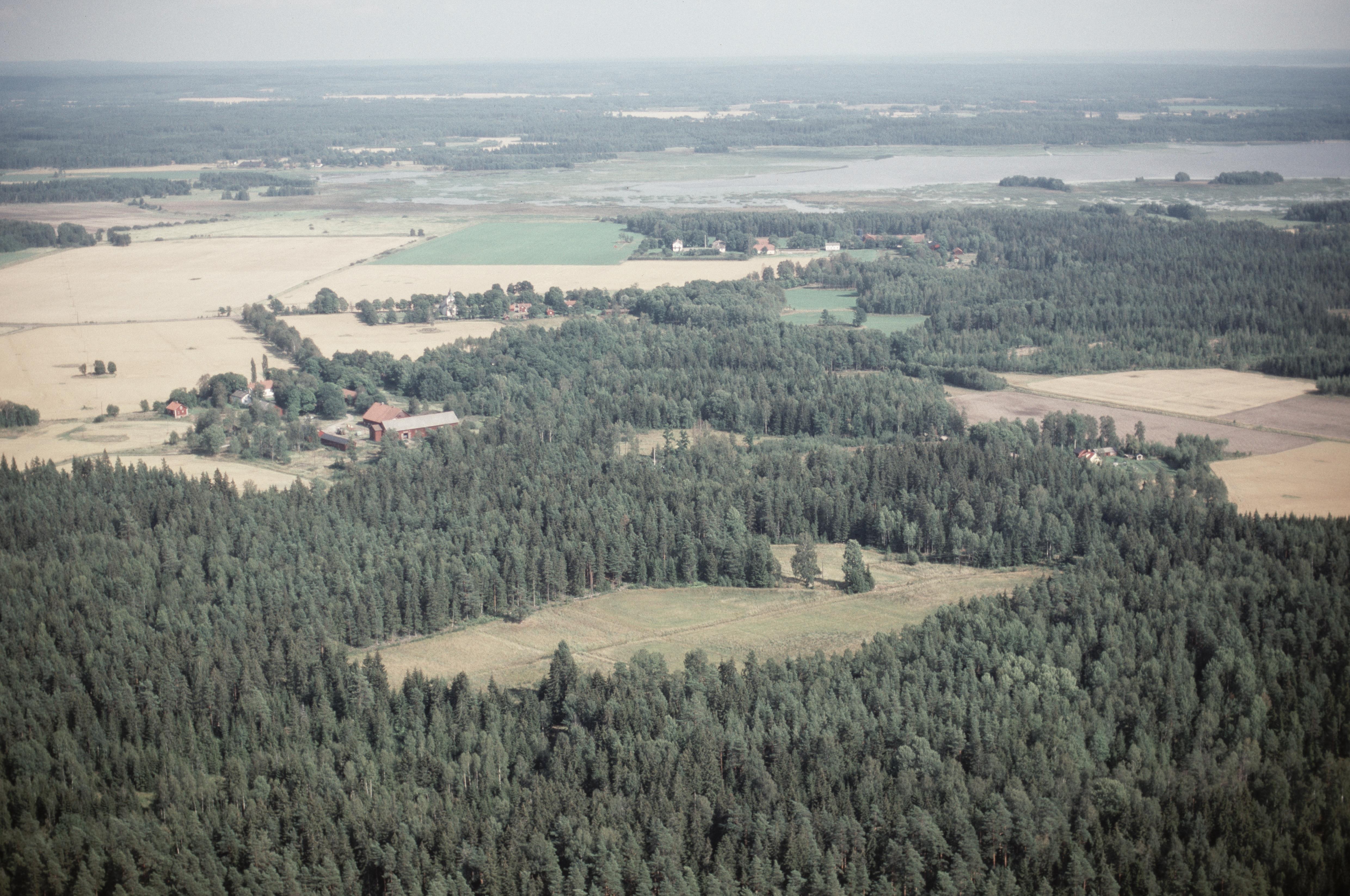 Fornlämningsområde vid Kilsby i bildens mitt med bl.a. Backa gravfält RAÄnr Visnums-Kil 1:1 och 11:1, kvarn 13:1. Visnums-Kils kyrka till vänster om bildens mitt. Kilsviken uppe till höger. Bilden är tagen mot (väderstreck): Ö