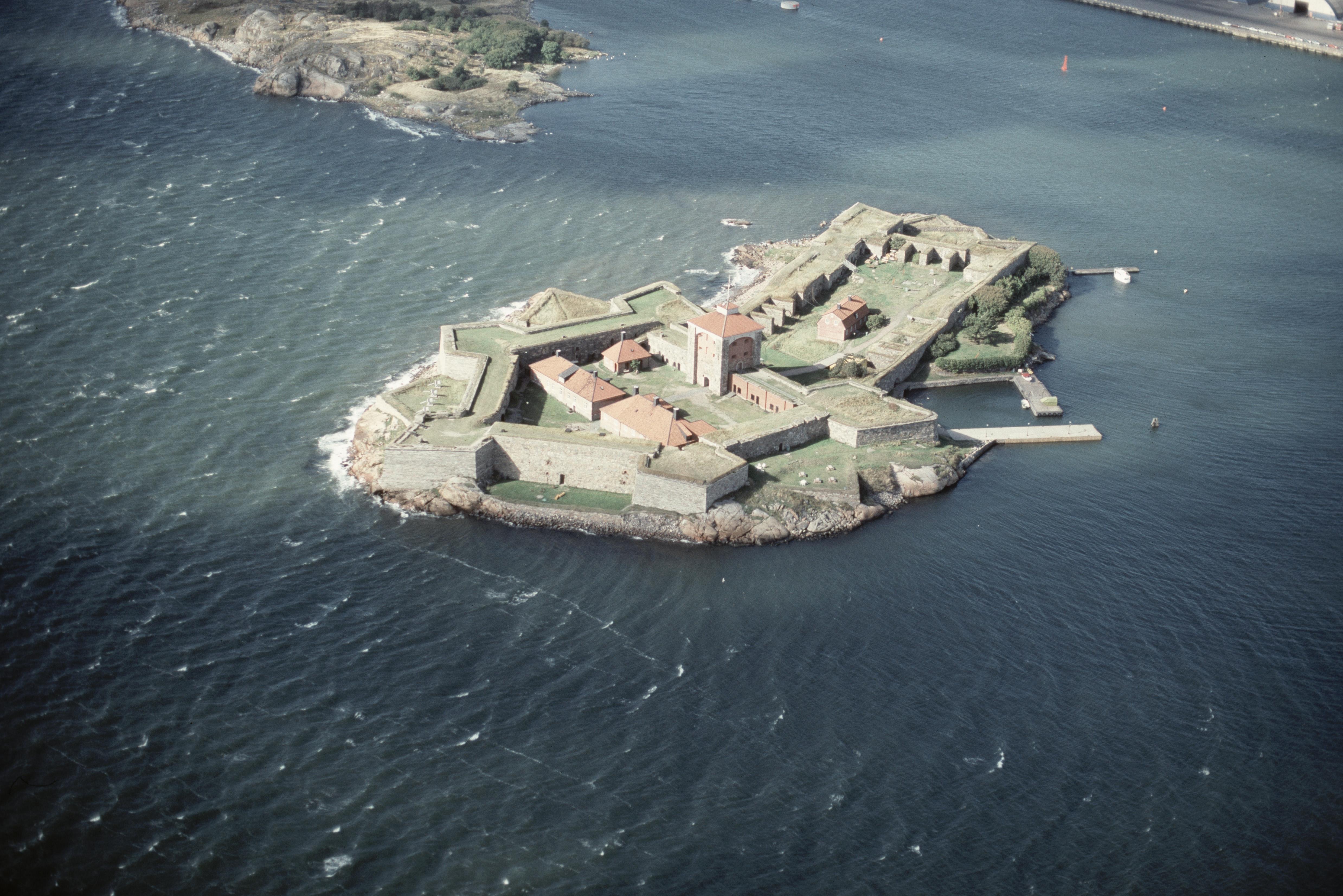(Tid. Västra Frölunda socken). Aspholmarna i Älvsborgsfjorden vid inloppet till Göteborgs stad. Nya Älvsborgs fästning RAÄnr Västra Frölunda 248:1. Bilden är tagen mot (väderstreck): NV