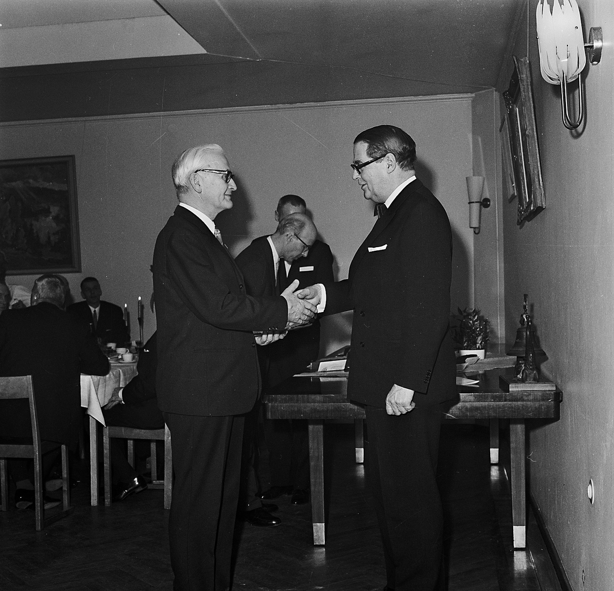 Kontorsskrivare Otto Frank, 49 tjänsteår, avtackas av direktör Stig Bergelin vid pensionärsträffen i december 1967.