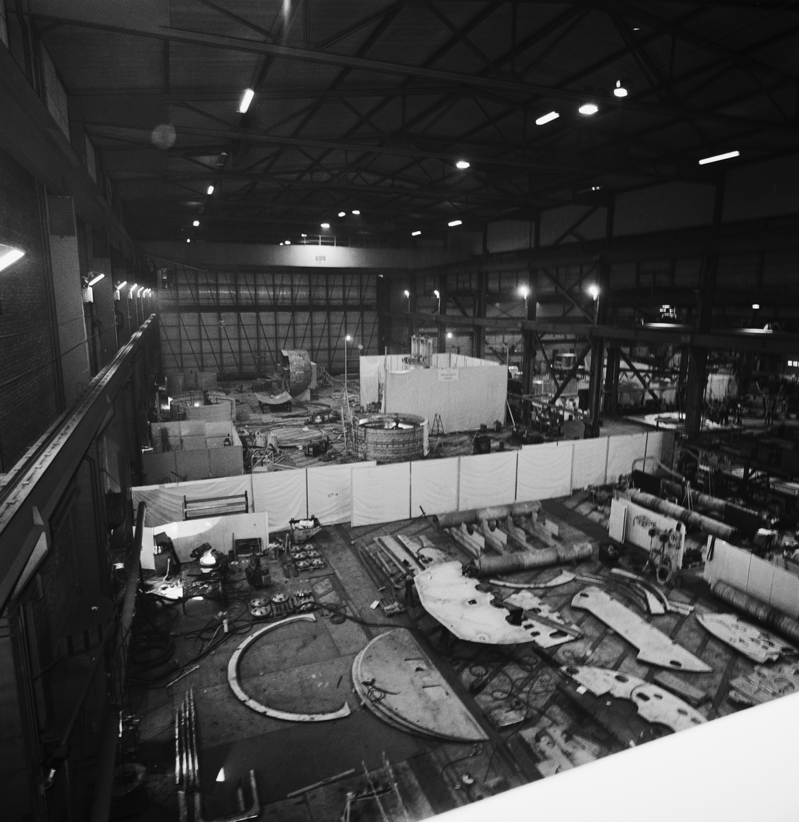 Översiktsbilder av ubåtstillverkningen i plåtverkst.
