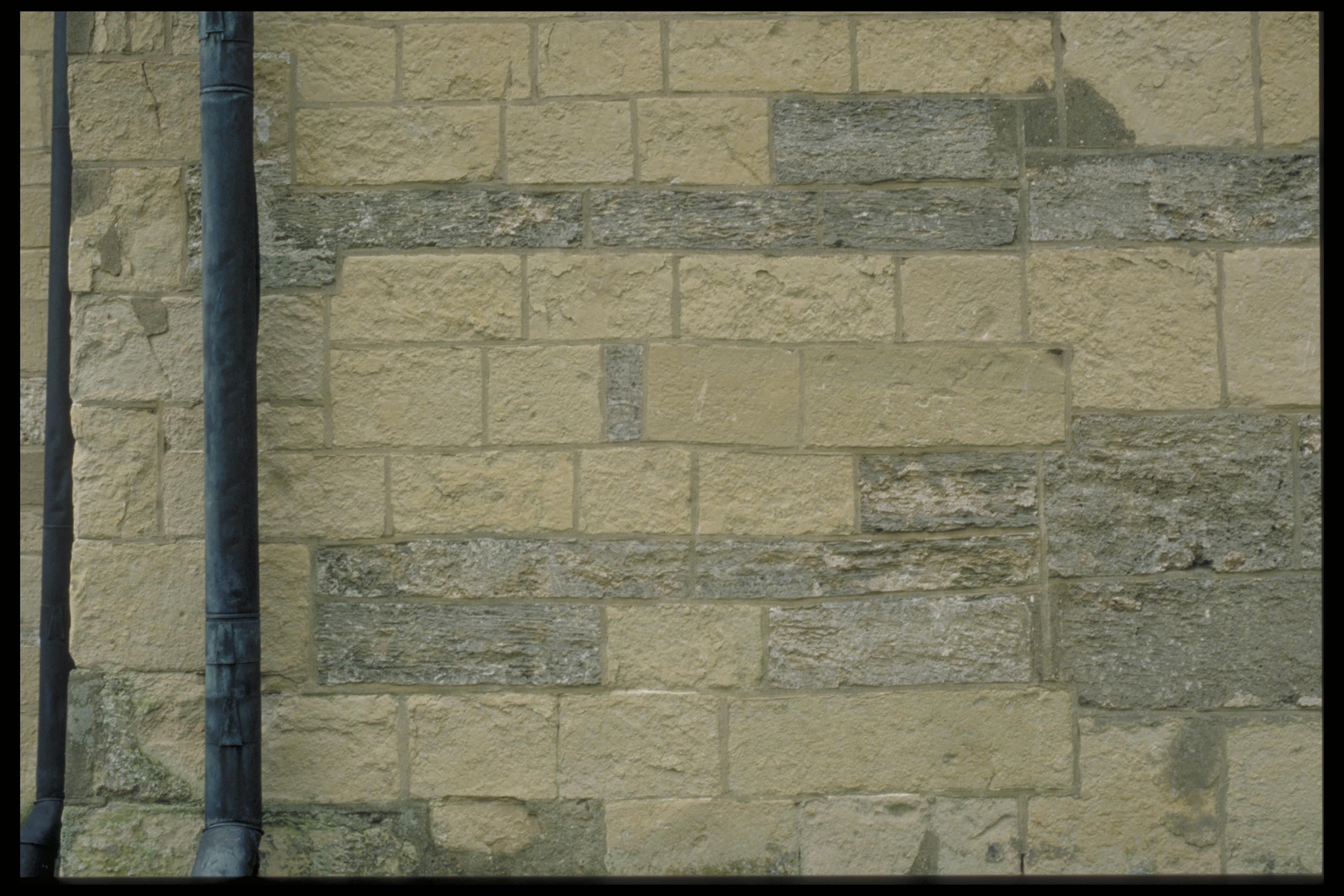 Långhusets norra fasad. Kvaderstenar vid koret.
