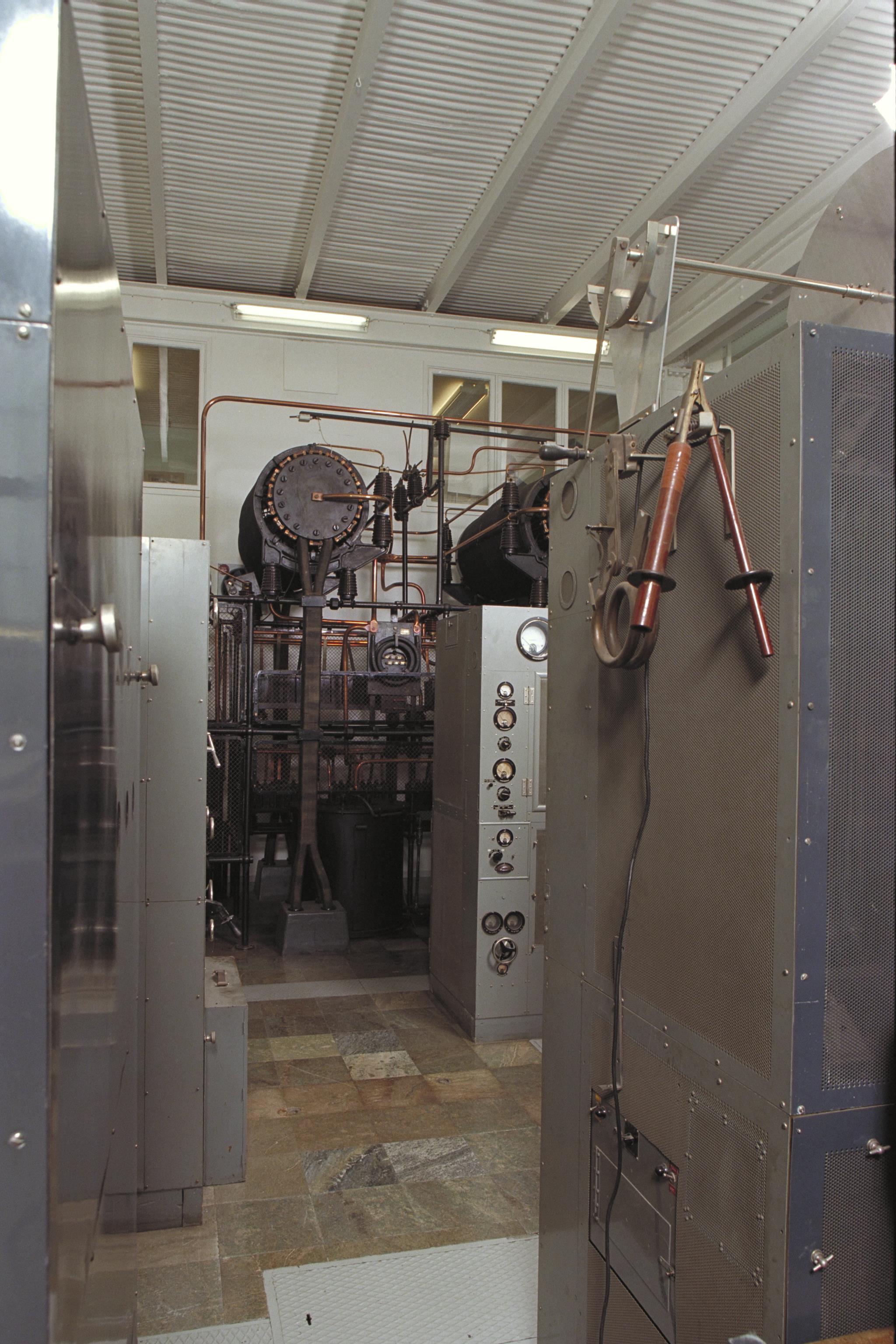 I förgrunden till höger 7 kW Marconi kortvågssändare. I bakgrunden stativ med slutstegs- och drivstegsspolar för olika frekvenstal.