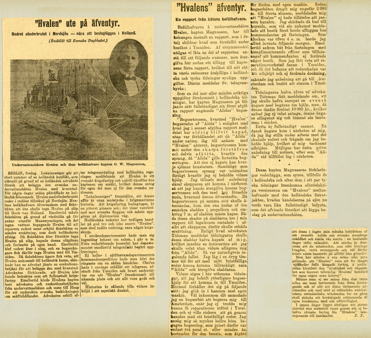 Tidningsurklipp om ubåten HVALENs hemfärd till Sverige från Italien.