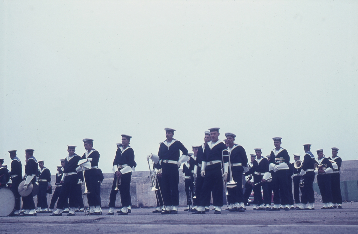 Militärmusikkår spelar i hamnen när Älvsnabben anlöper hamn