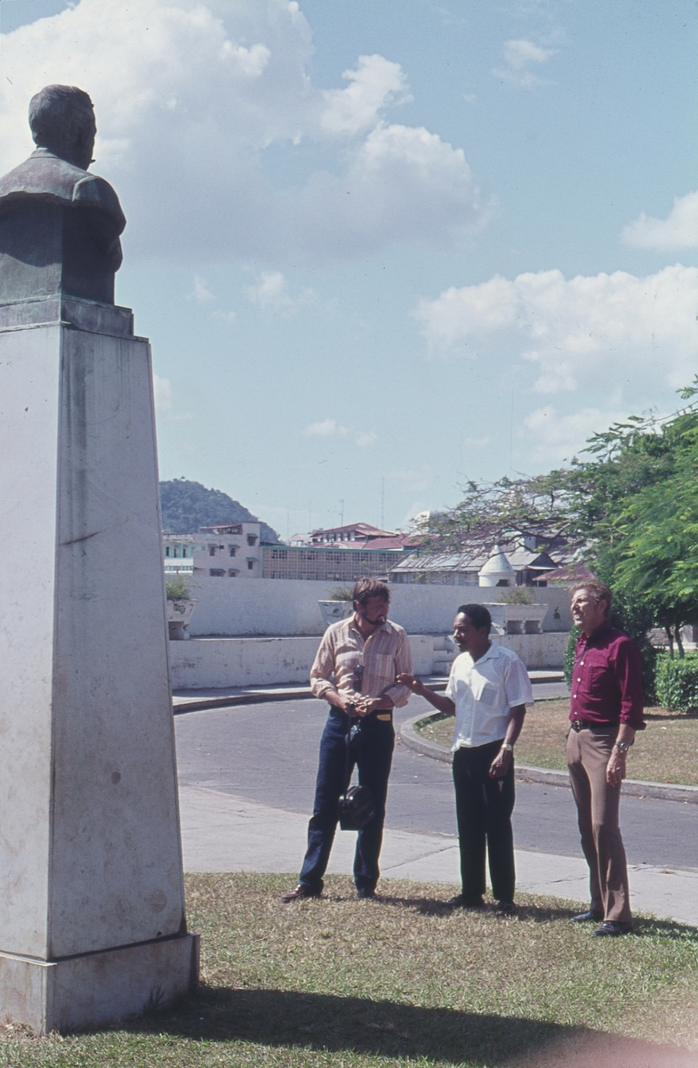 Två kollegur och en guide framför monument över Ferdinand de Lesseps, Plaza de Franca
