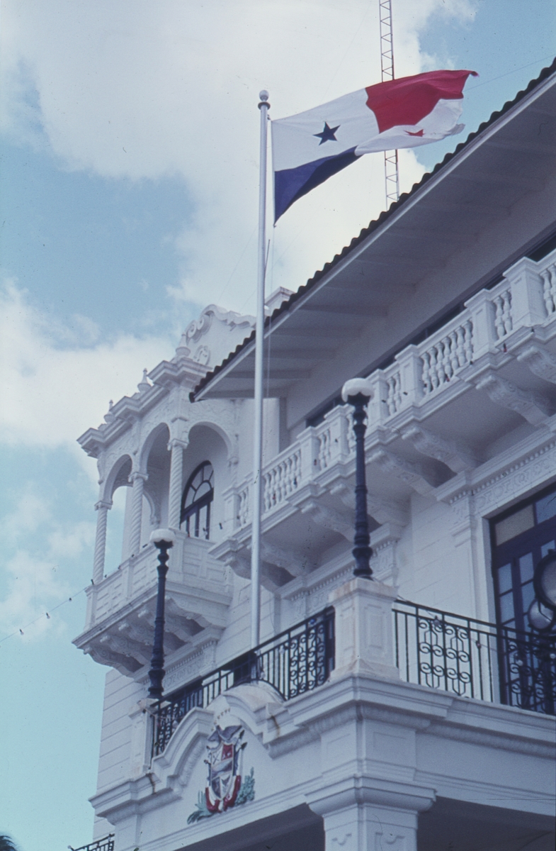 Palacio de las Garzas, presidentens kontor och bostad, Panamas flagga och devis Pro mundi Benefico
