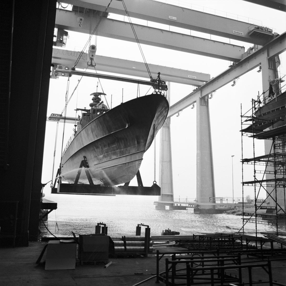 Lyft av patrullbåten Mjölner in i skrovhallen