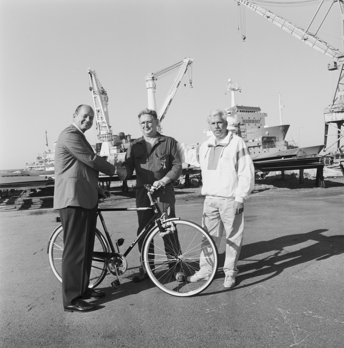 VD H. Hedman överlämnar cykel till vinnare av motionskampanjen