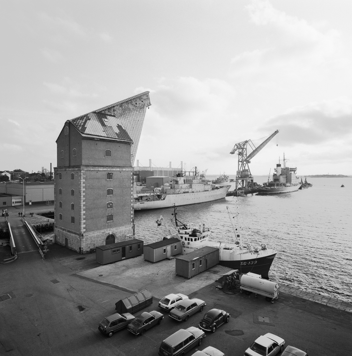 Titel: Vy av båtar i smådockorna och fartyg vid kajerna