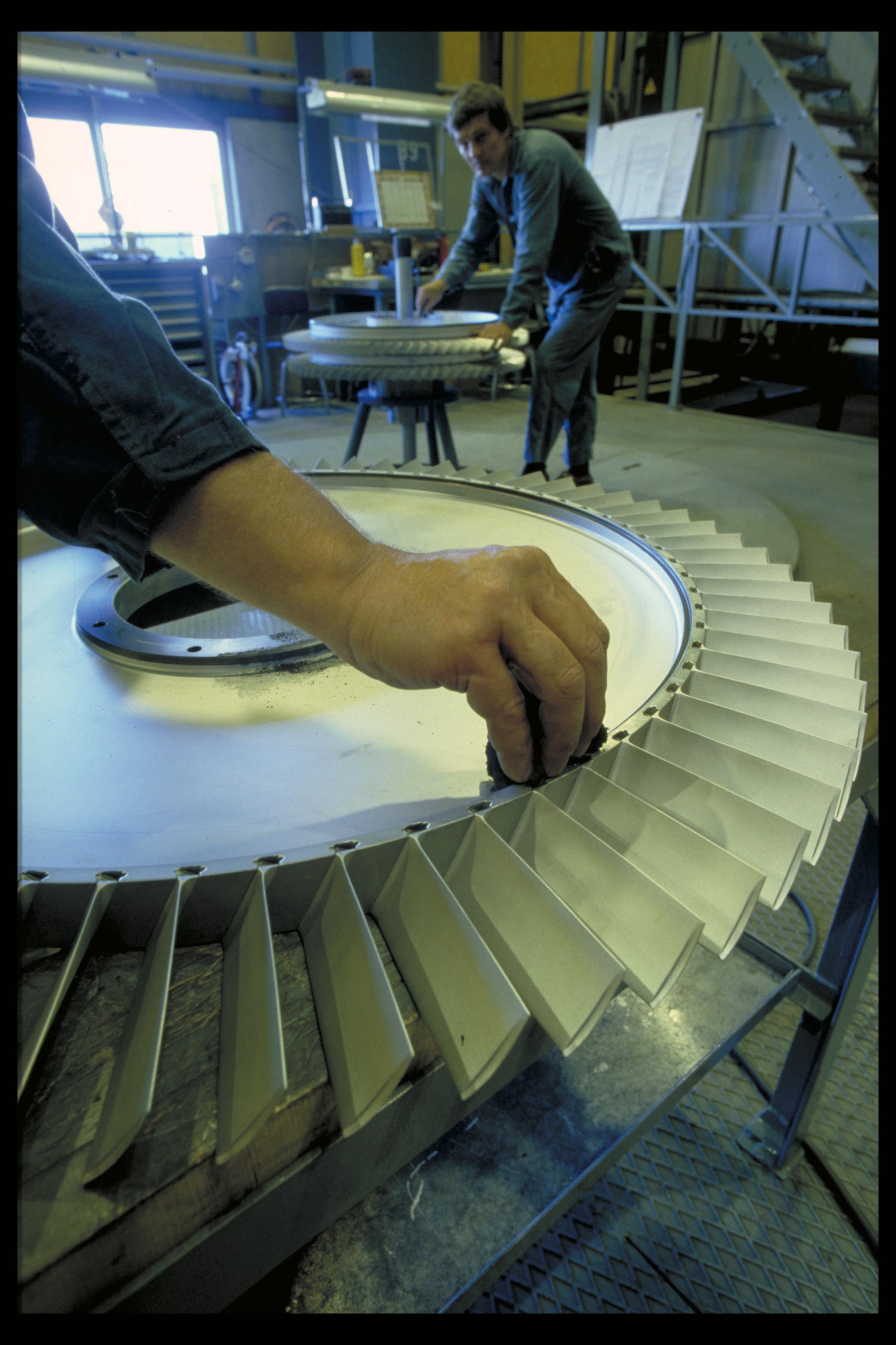 Turbintillverkning, montering av turbinblad. Bilden troligen från början av 1980-talet.