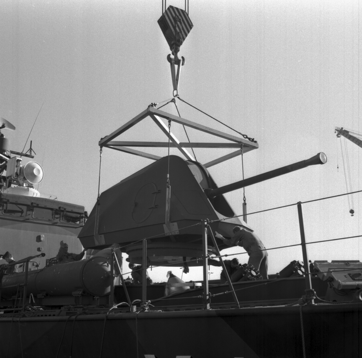 Lyft av 57mm kanon till kustkorvetten Stockholm\\\\anm. neg ingår i en serie om 11 st varav endast det första\\V 100394 scannats/gp