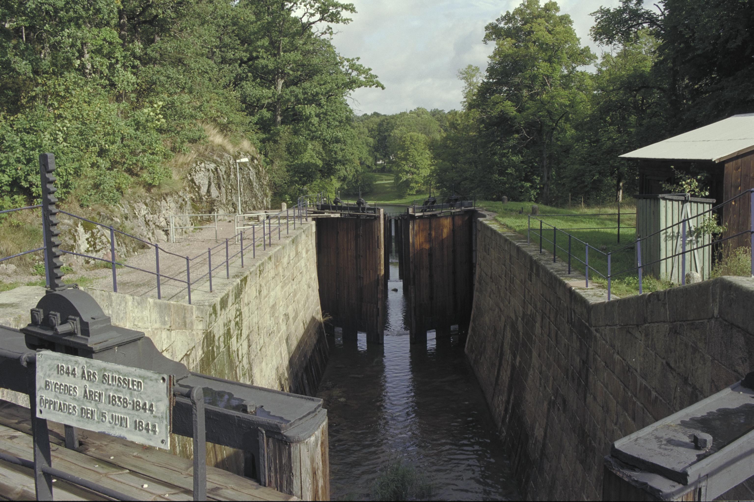 FMIS: Trollhättan 156:1 Mellersta slussen i 1844 års slussled, med Informationsskylten i bild.
