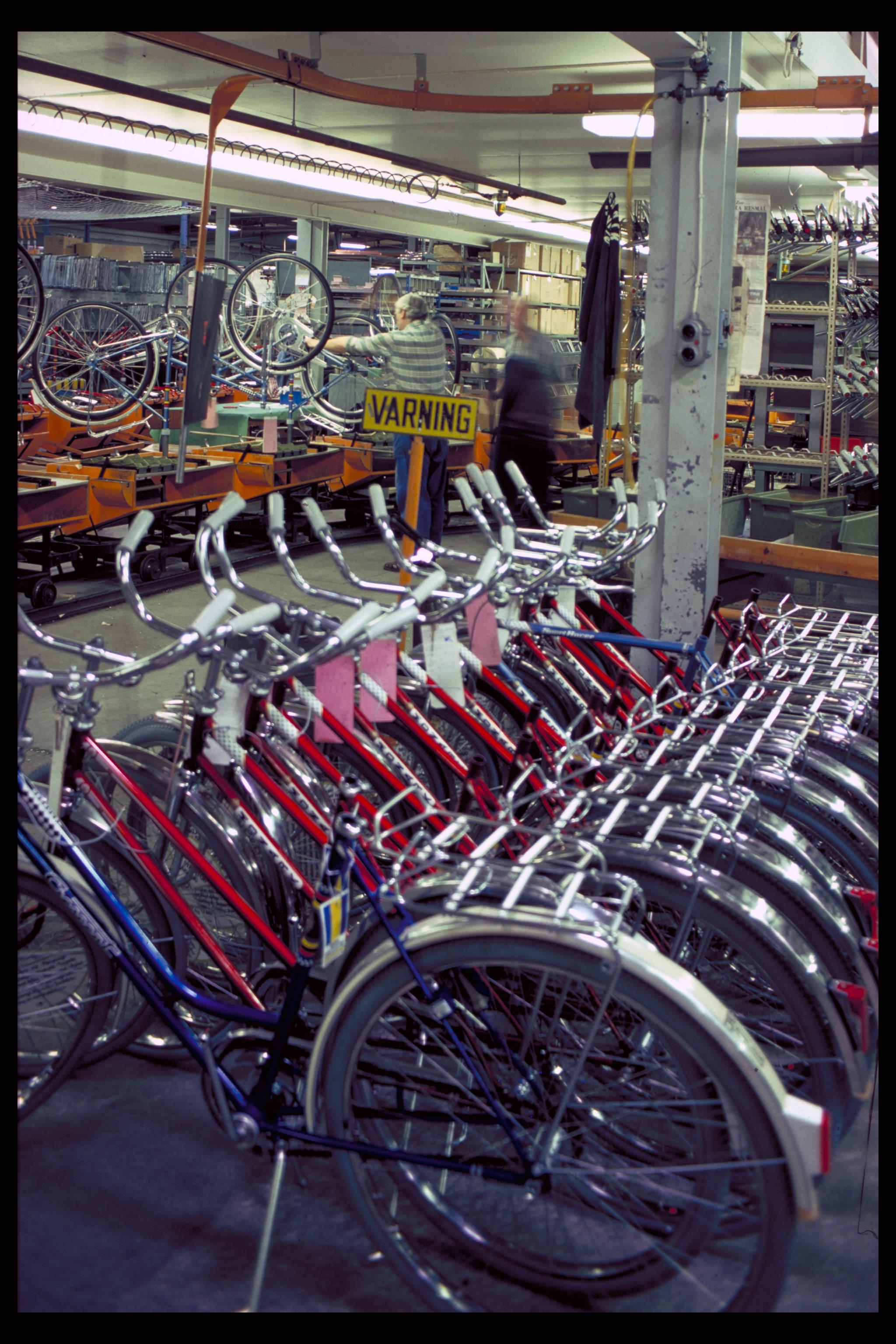 Tillverkning av cyklar. Bilden troligen från mitten av 1970-talet.