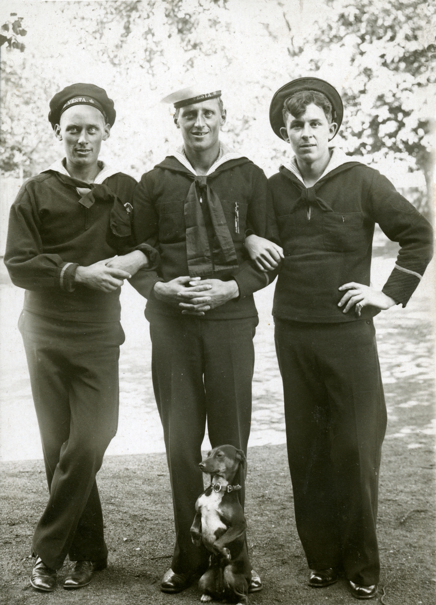 Sjömän och skeppshunden "Fröken Lady Perseus". I mitten står Gustaf Andersson.