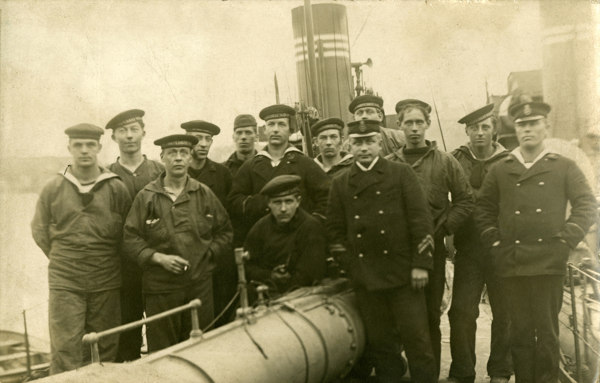 Gruppbild med sjömän ombord en torpedbåt. Gustaf Andersson heter andra personen från höger sida.