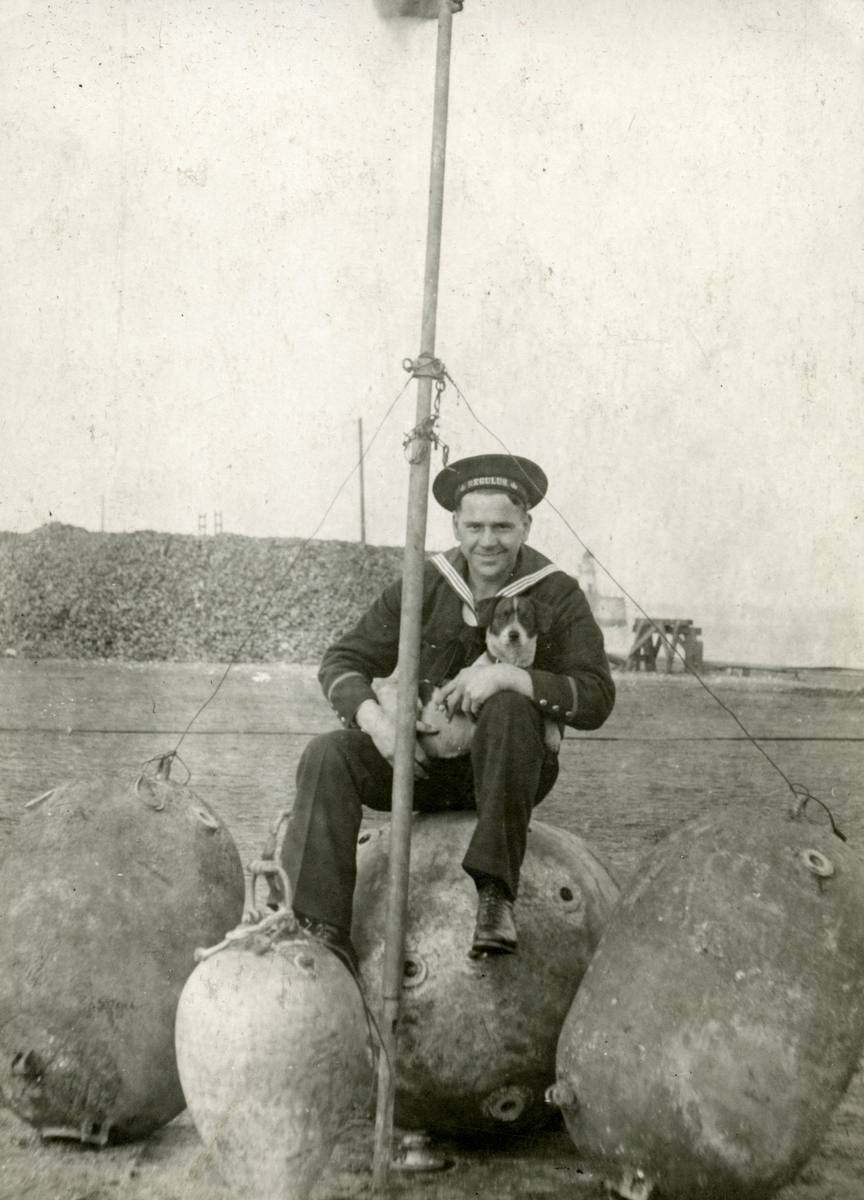 Sjöman med skeppshund i famnen. På sjömannens mössband står texten "Regulus".