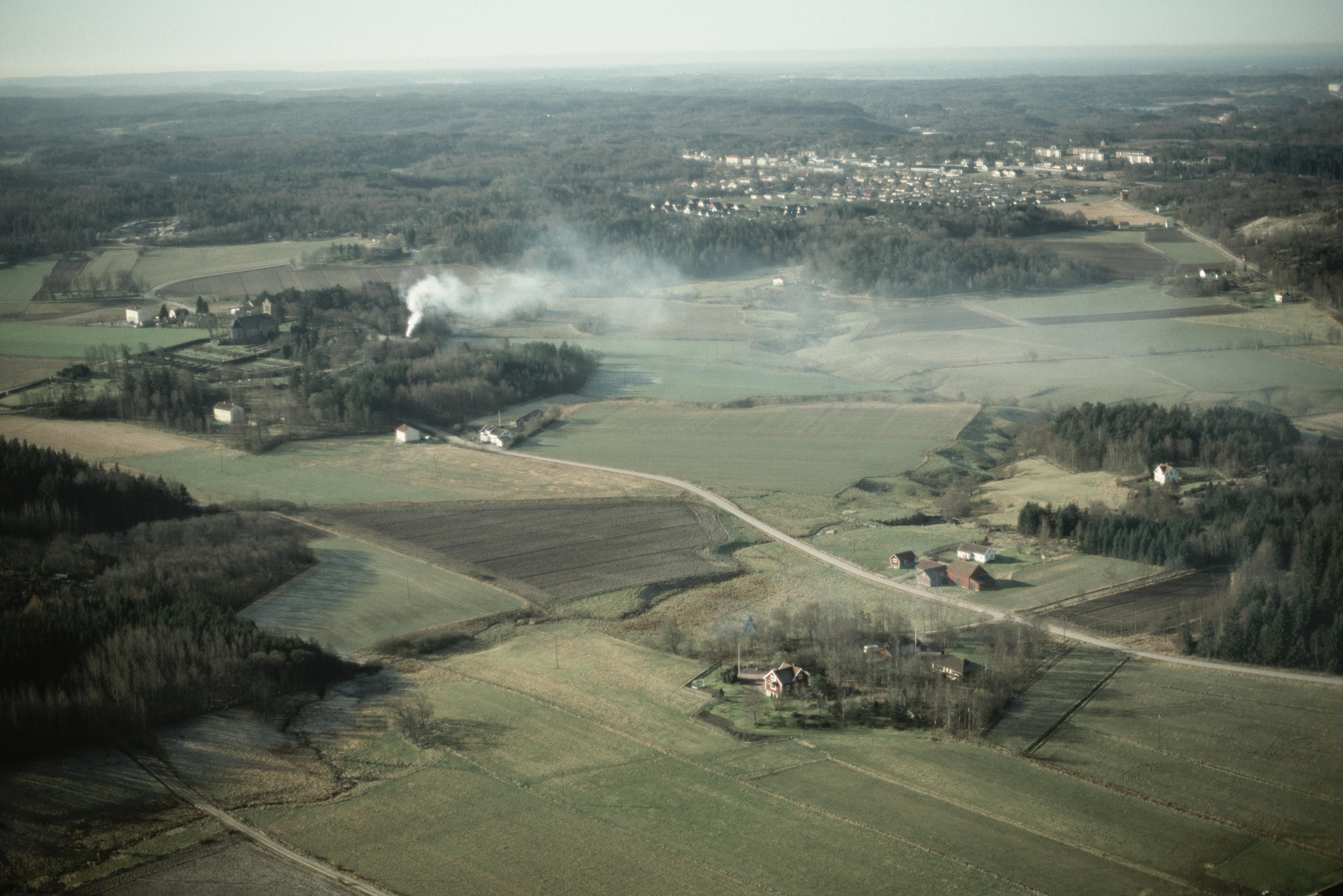 Kvarnebäcken vid Immestad. Uppe till vänster Brastads kyrka och kyrkby. Stensättning RAÄnr 34:1 och gravfält RAÄnr Brastad 33:1 nere till höger. Bilden är tagen mot (väderstreck): SSV