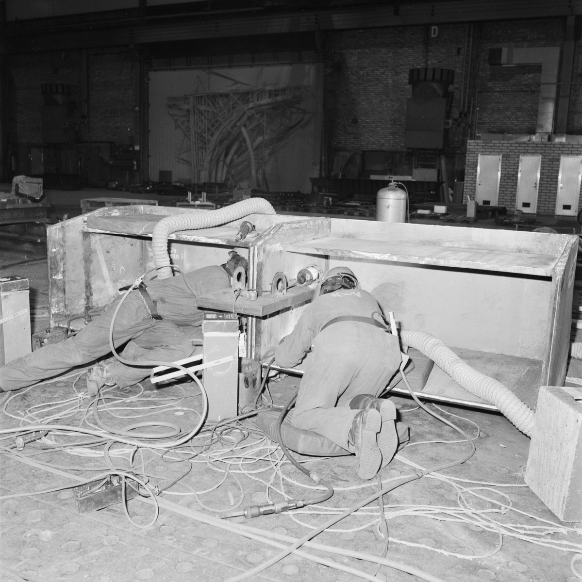 Arbete med bostadsplattform till oljerigg i plåtverkst.