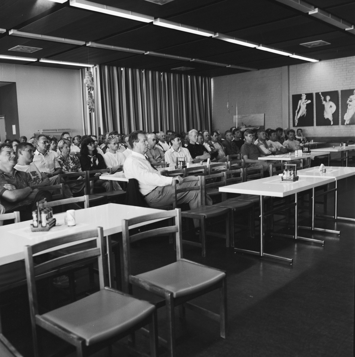 VD Hedman informerar för personal från Ts o tele i matsalen kv-nytt