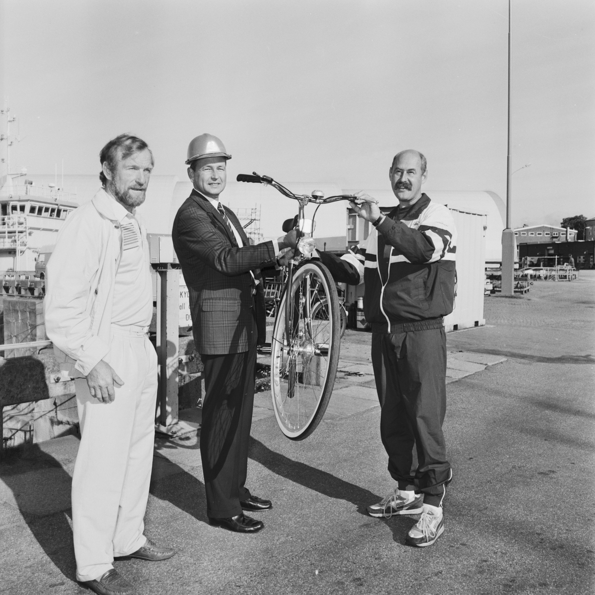 Titel: VD H. Hedman överlämnar cykeln till vinnaren C. Carlsson i motionstävlingen