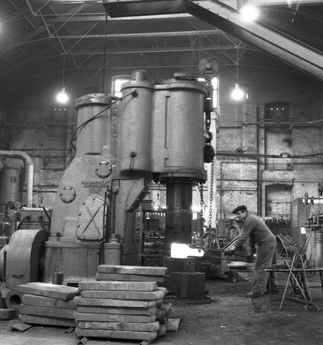 Smeden Harry Holmqvist smider stålämnen till Svenska Kullagerfabriken. Det har funnits smedjor på varvet i nästan 300 år. Den första anlades på 1680-talet på Wämövarvet. Den sista avvecklades på 1970-talet.