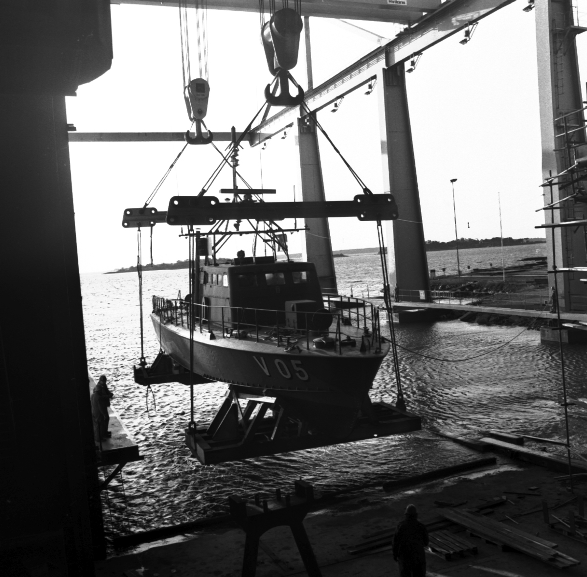 Sjösättning av vedettbåten V 05\\\\anm: neg ingår i serie om 22 st varav det första samt 1 till scannas. Detta är V 91496/gp