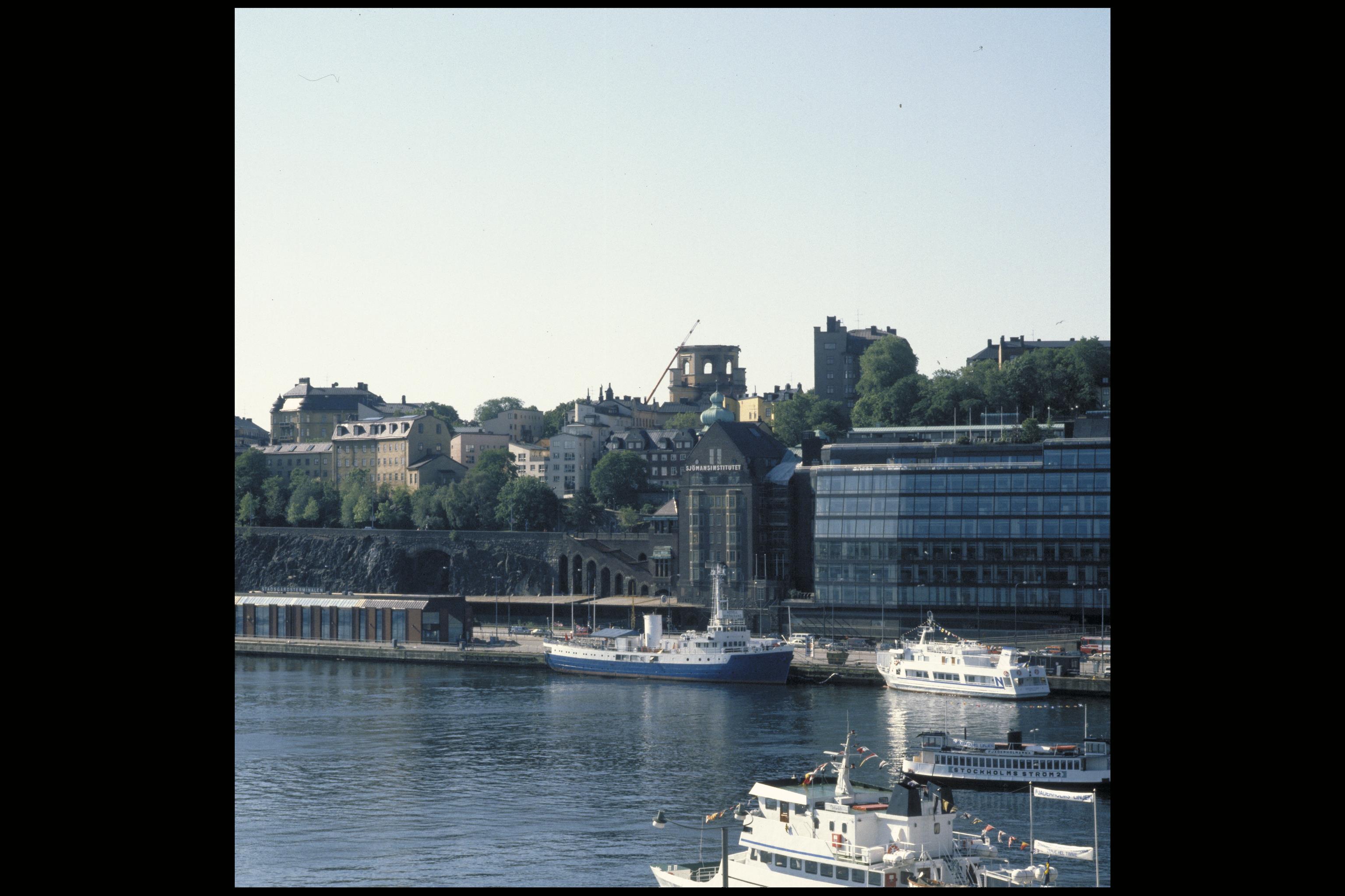 Från Skeppsholmen mot Katarina kyrka efter branden den 17 maj 1990.