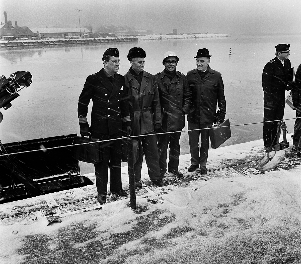 Leveransbesiktning av ubåten Sjöbjörnen 1969. På däck synes från vänster: marindirektören Thorsten Lundberg, Malmö, besiktningsmannen f marinöverdirektören Ivar Oldenburg, nybyggnadsingenjören Erik Persbeck och en medhjälpare.