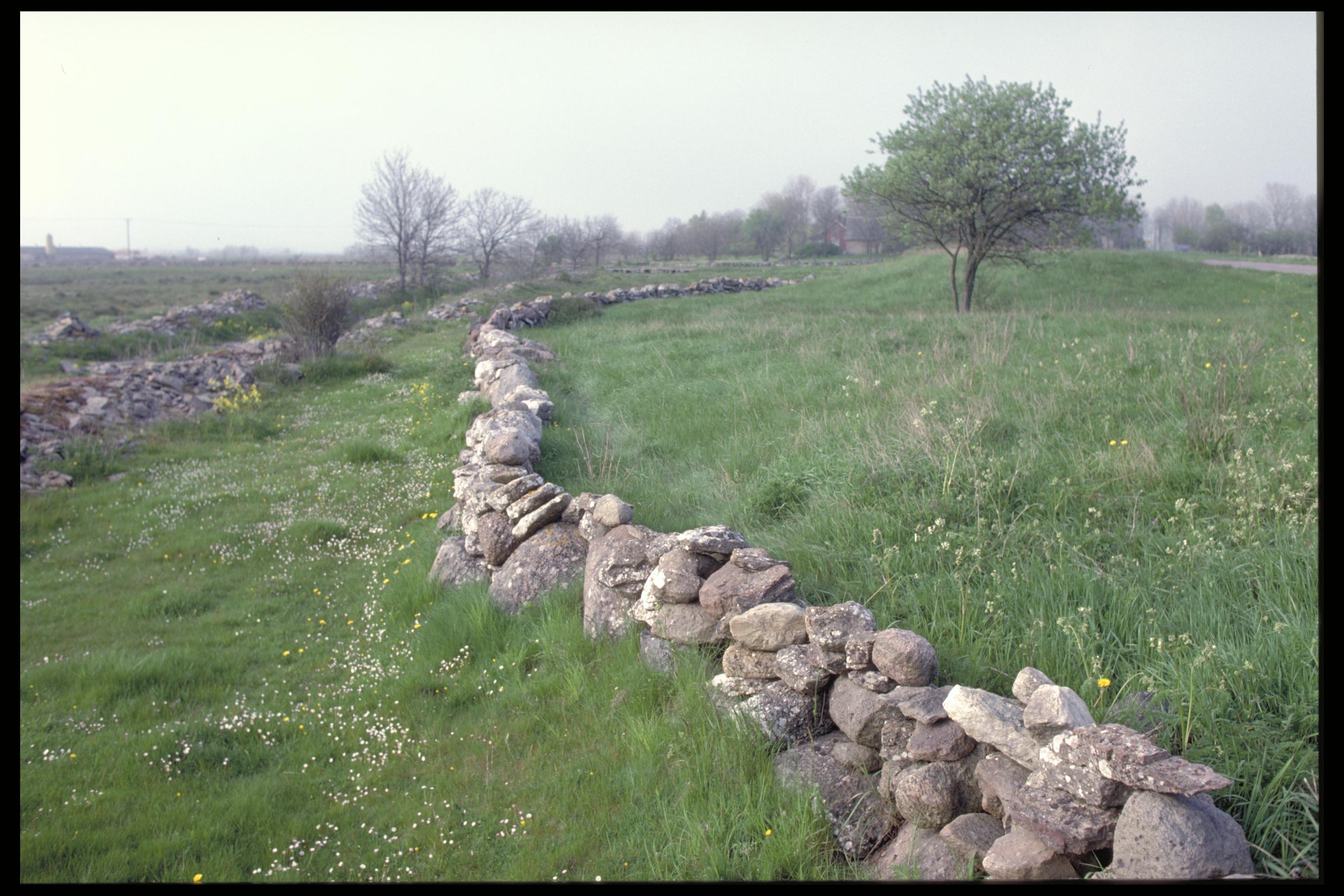 Stenmurar som bildar fägator. Synlig gravhög till höger i bild.
