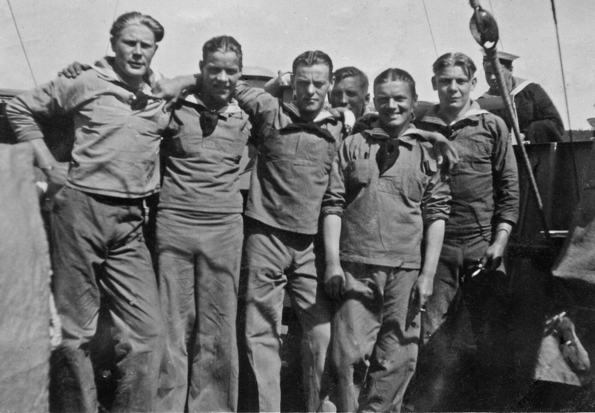 Värnpliktiga sjömän uppställda på rad. Eventuellt på backen.