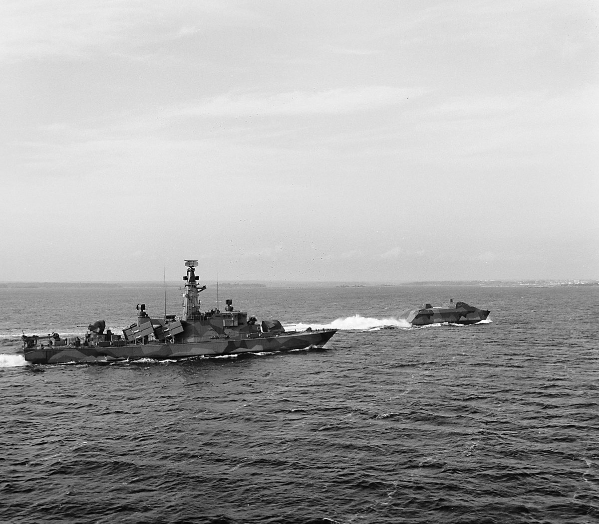Kustkorvetten Göteborg och testfartyget Smyge under gång. Foto 1992. Erfarenheteran från Smyge ligger till grund för konstruktionen av nästa generation kustkorvetter.