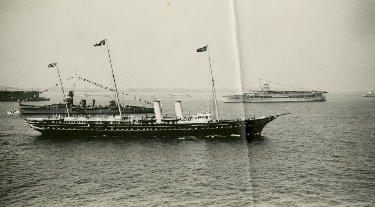 Engelska kungajakter /kröningen av George VI, 20 maj 1937. Förutom kungaskeppet HMY Victoria & Albert, till höger i bilden syns hangarfartyget HMS Glorious, och Hangarfartyget HMS Courageous syns i vänstra bildkanten. Bakom Kungafartyget ligger troligtvis HMS Carlisle.