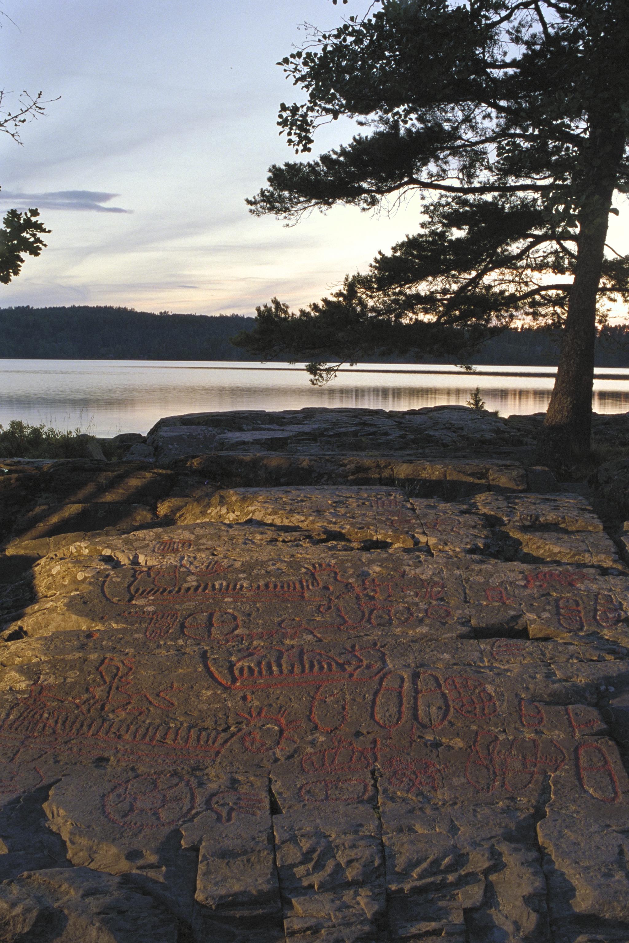 RAÄ-nummer Tisselskog 15:1. Hällens "framsida" av dess sydligaste del, Ronarudden. Skeppsfigurer, fotsulefigurer och hjulkors.